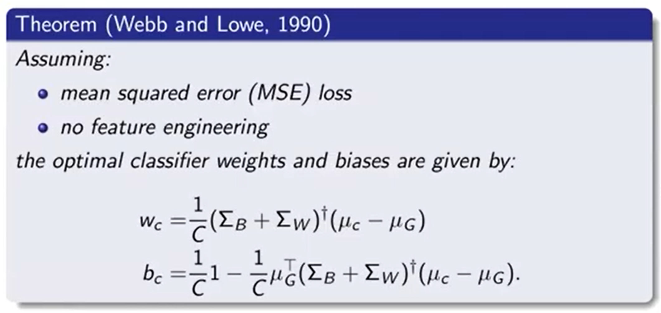 Between-class covariances: \(\quad \Sigma_B = \langle (\mu_c-\mu_G)(\mu_c-\mu_G)^T \rangle_{c}\)