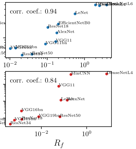 $$R_f = \frac{\langle \|f(\tau x) - f(x)\|^2\rangle_{x, \tau}}{\langle \|f(x + \eta) - f(x)\|^2\rangle_{x, \eta}}$$