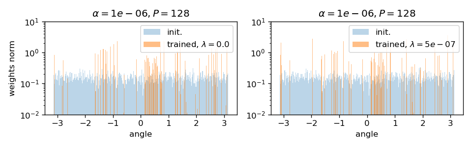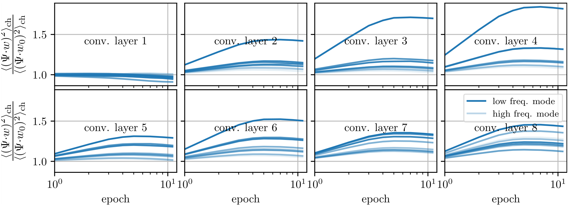 We take a basis that is the eigenvectors of the Laplacian on the 3x3 grid and follow weigths evolution on each of the components and average over the channels: