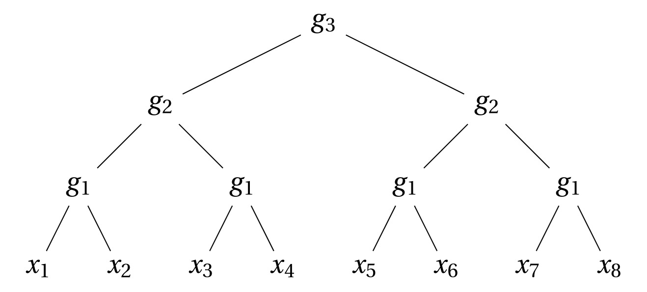 We consider hierarchically compositional and local tasks of the form: $$f^*({\bm x}) = g_3(g_{2}(g_{1}(x_1, x_2), g_{1}(x_3, x_4)), g_{2}(g_{1}(x_5, x_6), g_{1}(x_7, x_8))).$$