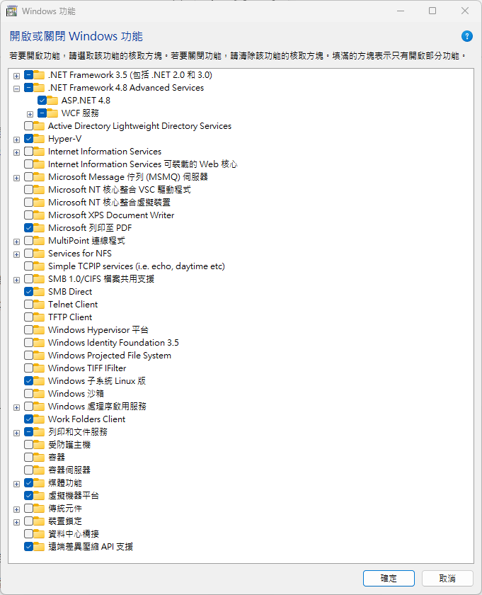 開啟Hyper-V、虛擬機器平台設定才能安裝WSL2