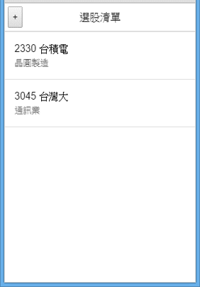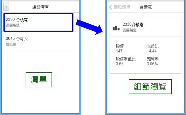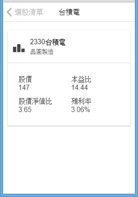 {id: 2330, name: '台積電', price: 147.0, PER: 14.44, PBR: 3.65,