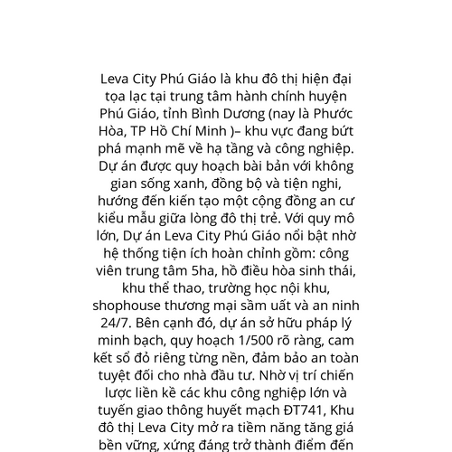 Website: https://greenhomesland.vn/du-an/leva-city-phu-giao/. Leva City Phú Giáo là khu đô thị hiện đại tọa lạc tại trung tâm hành chính huyện Phú Giáo, tỉnh Bình Dương (nay là Phước Hòa, TP Hồ Chí Minh )– khu vực đang bứt phá mạnh mẽ về hạ tầng và c