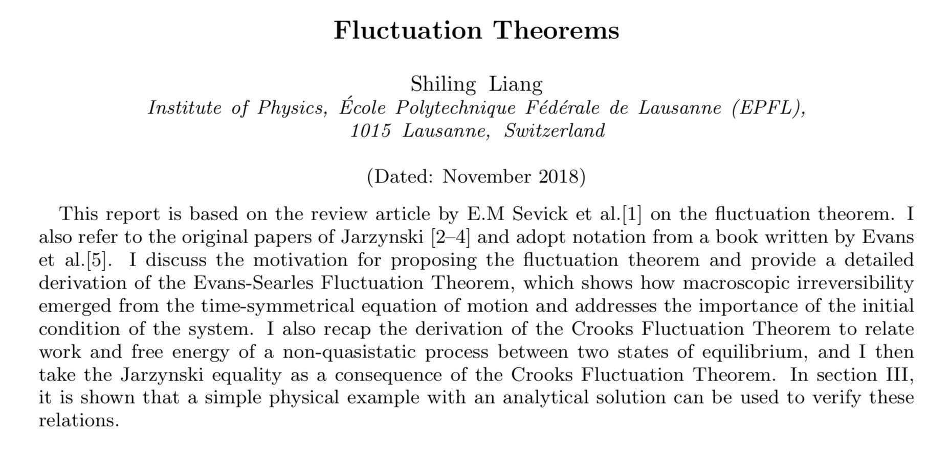 [Crooks Fluctuation Theorem] \(\,\quad P(x(t))/P(x_{\text{reverse}}(t)) = \exp[(w-\Delta F)/k_BT]\)