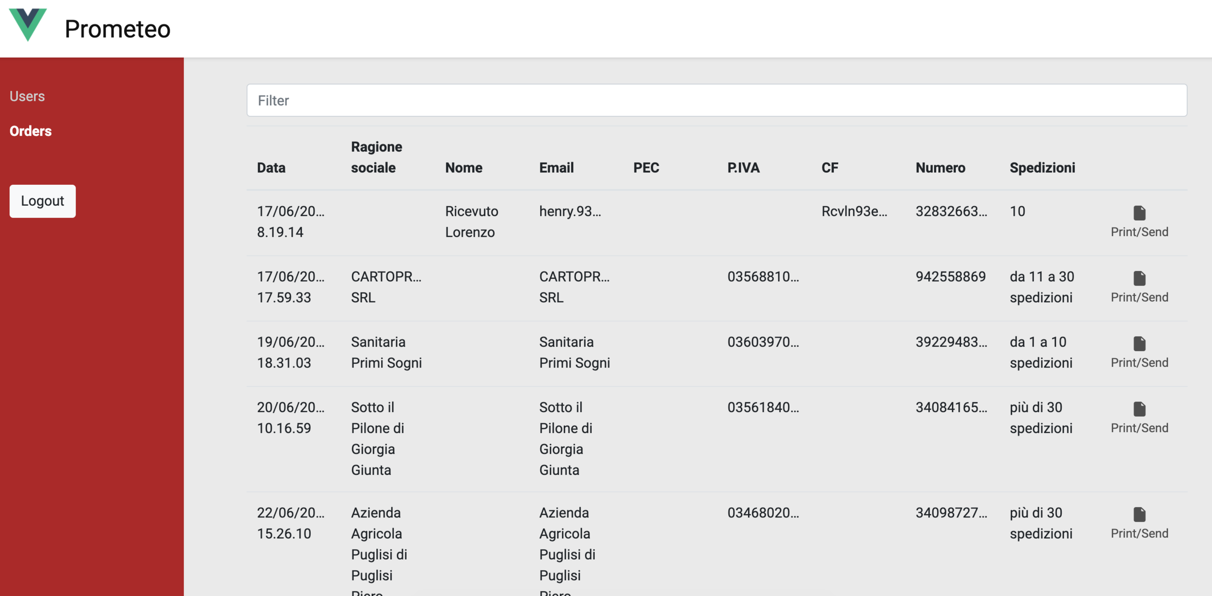 "Prometeo" è una piattaforma che gestisce il flusso di lavoro e le categorie di servizi/prodotti che compongono un contratto, inoltre raccoglie i dati dei clienti così da contattarli direttamente tramite i dati telefonici/mail.