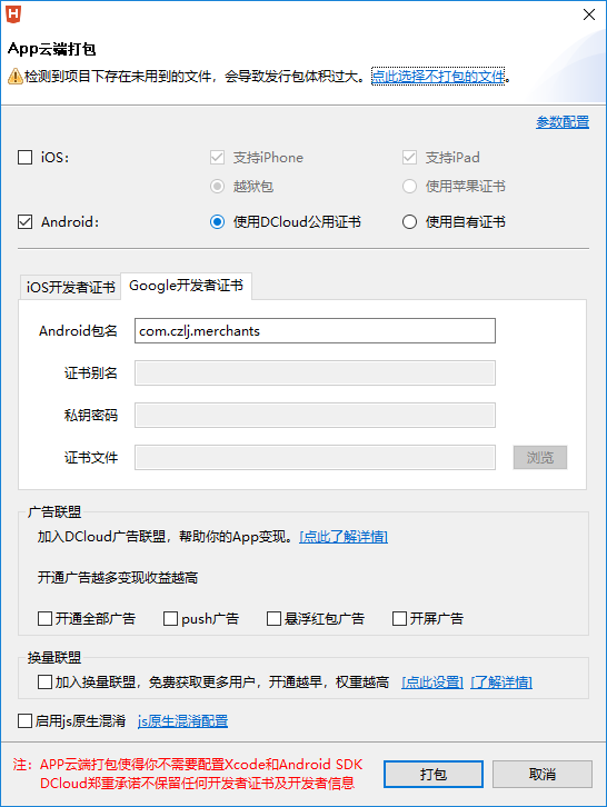 打包IOS需要苹果的开发者证书,不然要设备越狱才能安装
