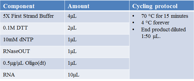 -Each reaction: 0.25μL forward primer, 0.25μL reverse primer, 10μL SybrGreen PCR Mastermix, 8μL deionized water, and 1μL cDNA.