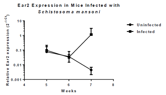 -Ear2 expression is up-regulated during Week 7 of Schistosomiasis, when immune response switches from Th1 to Th2.