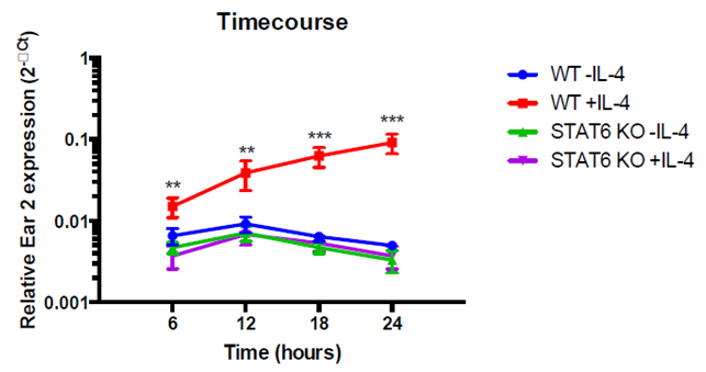 Fig. 4. Macrophages were isolated from WT and STAT6 KO mice and then treated with (+) or without (-) IL-4. Six hours after the IL-4 treatment, Ear2 is down-regulated in STAT6 KO mice as compared to WT mice. After 12 hours, there is a clear difference between Ear2 expression in WT mice and in STAT6 KO mice. Over time, the difference in expression begins to grow significantly.