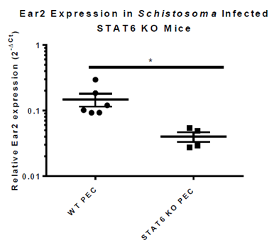 •Ear2 expression is significantly lower in STAT6 KO (knockout) mice and helminth-infected STAT6 KO mice (Fig. 4 and Fig. 5)
