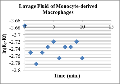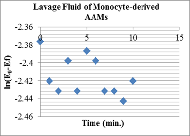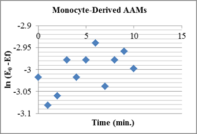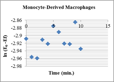 Fig. 6a, 6b. Ribonuclease activity can be calculated using the slope: Δln (E0-Ef)/Δt. However, since both graphs show non-linear relationships, there is an insignificant amount of Ear2 enzyme activity in both monocyte-derived macrophages and monocyte-derived AAMs.