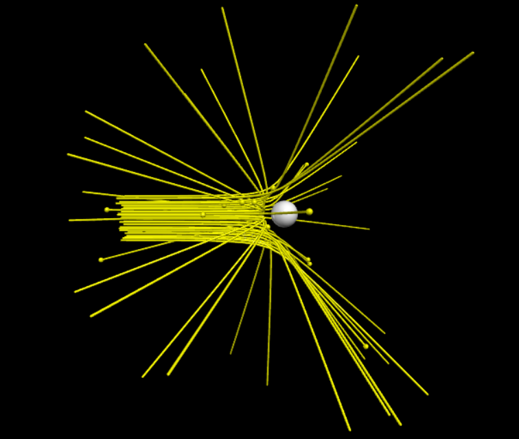 gas.append( sphere(pos = vector((-d*cos(theta)+r*r_dom*cos(p_dom*2*pi)*sin(theta)),(d*sin(theta)+r*r_dom*cos(p_dom*2*pi)*cos(theta)),(r*r_dom*sin(p_dom*2*pi))) , radius = 0.05, v = vec(v0*cos(theta),-v0*sin(theta),0) , Fx = 0 , color=color.yellow,visible = True,make_trail=True))