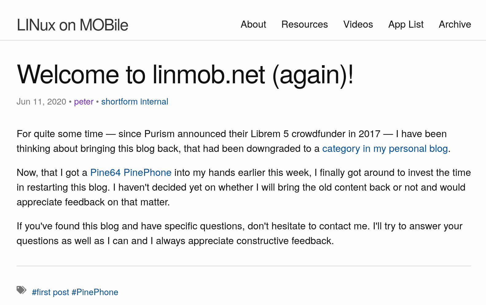- Restarted LINMOB.net (as a Jekyll blog on GitHub pages) on June 11th, 2020