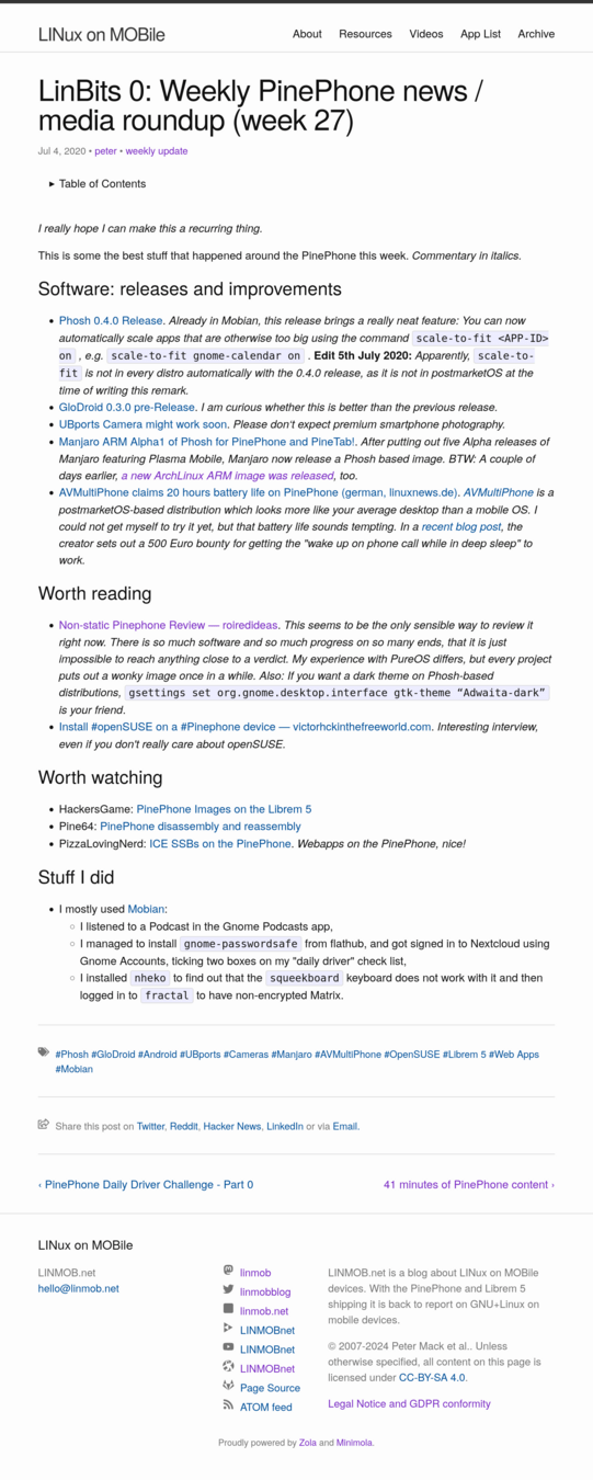 - 2020-07-12 LinBits 1: Weekly PinePhone news / media roundup (week 28)