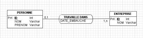 La relation entre l'entité PERSONNE et ENTREPRISE a une cardinalité de 0-1 :