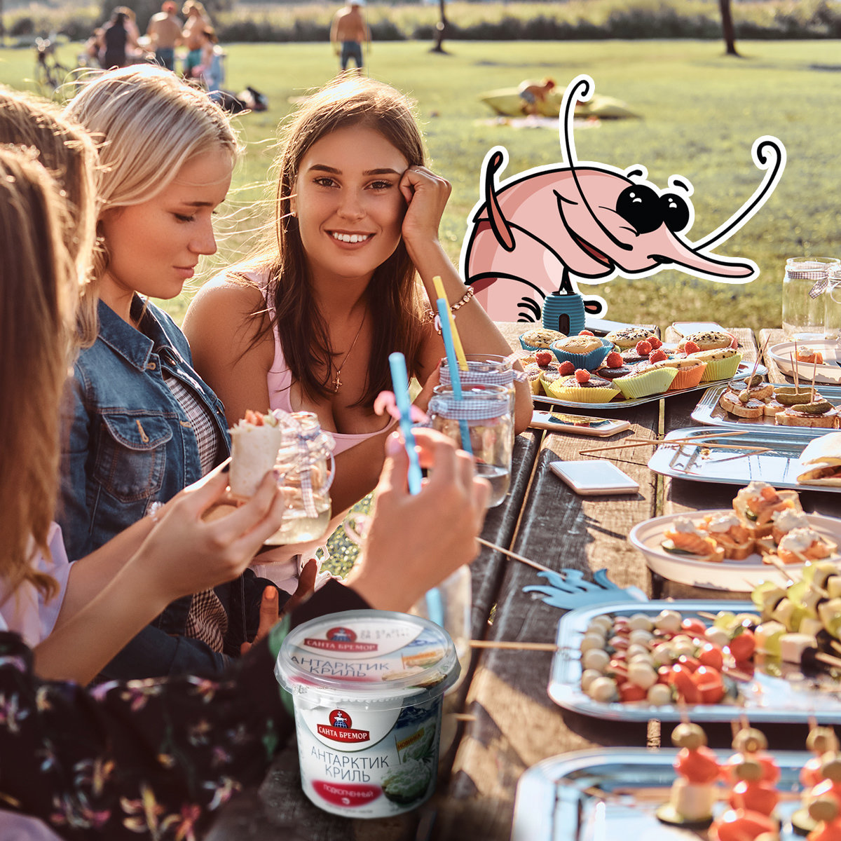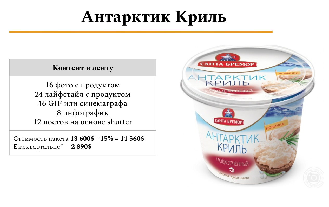 Вводим в бренд персонажа “Криль-Кирилл” для того, чтобы был постоянный триггер-ассоциация и подсказка на состав продукта. Используем его во всех единицах контента (позиционирование как “парня, который портит все фотки”).