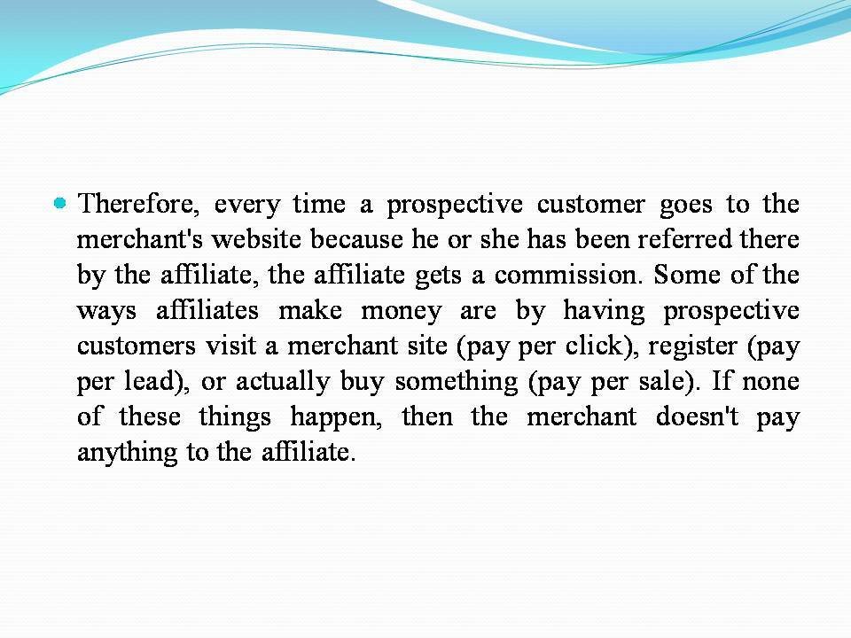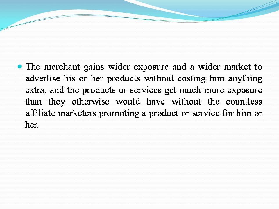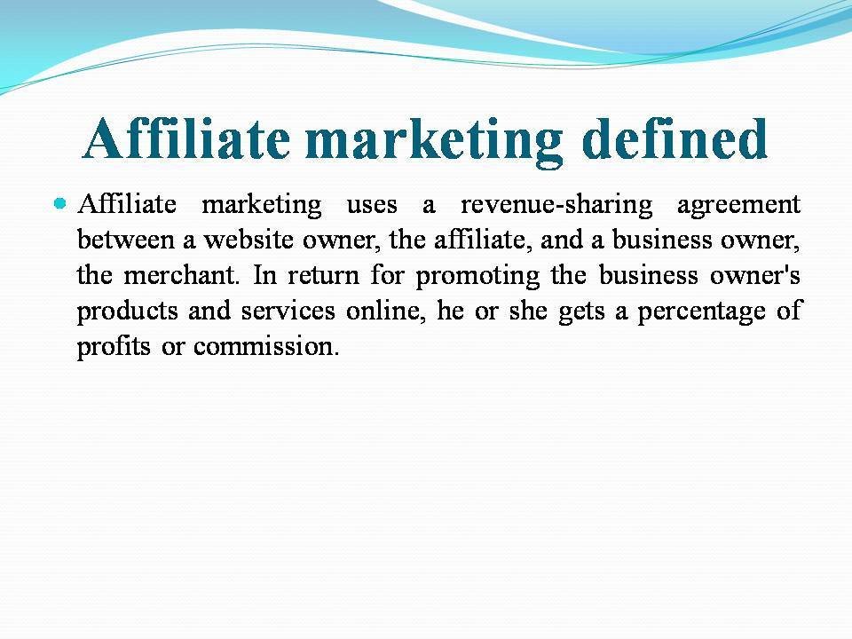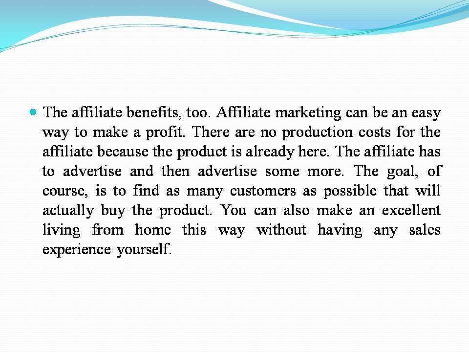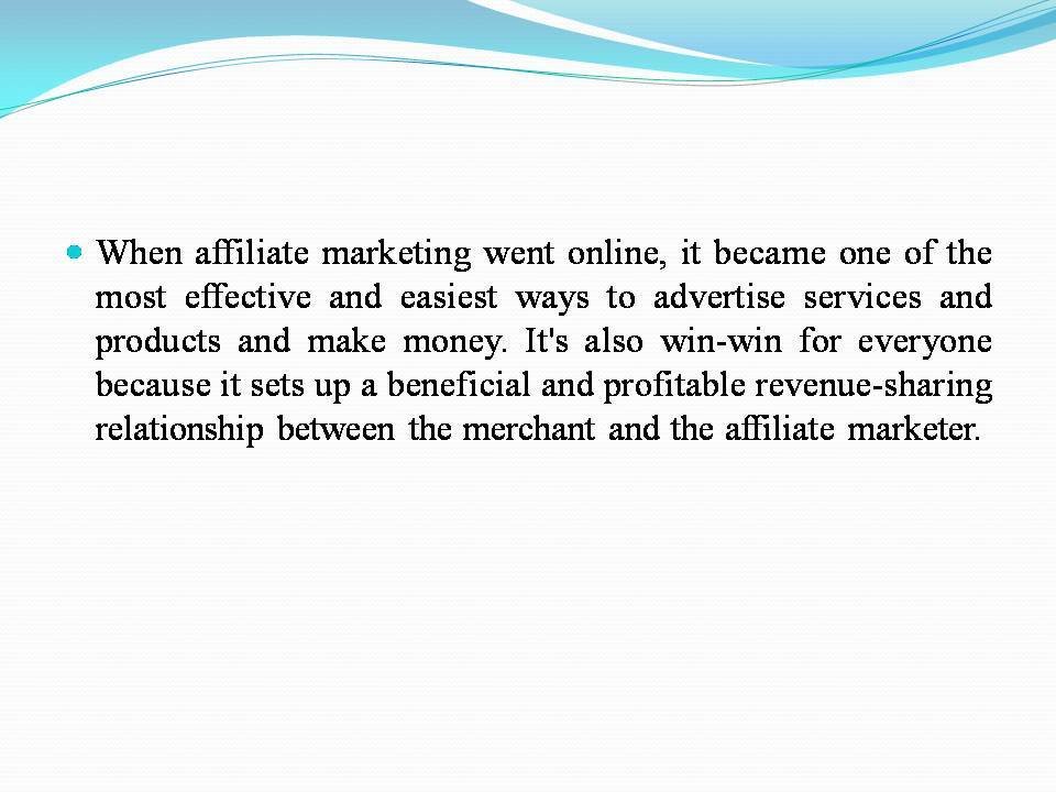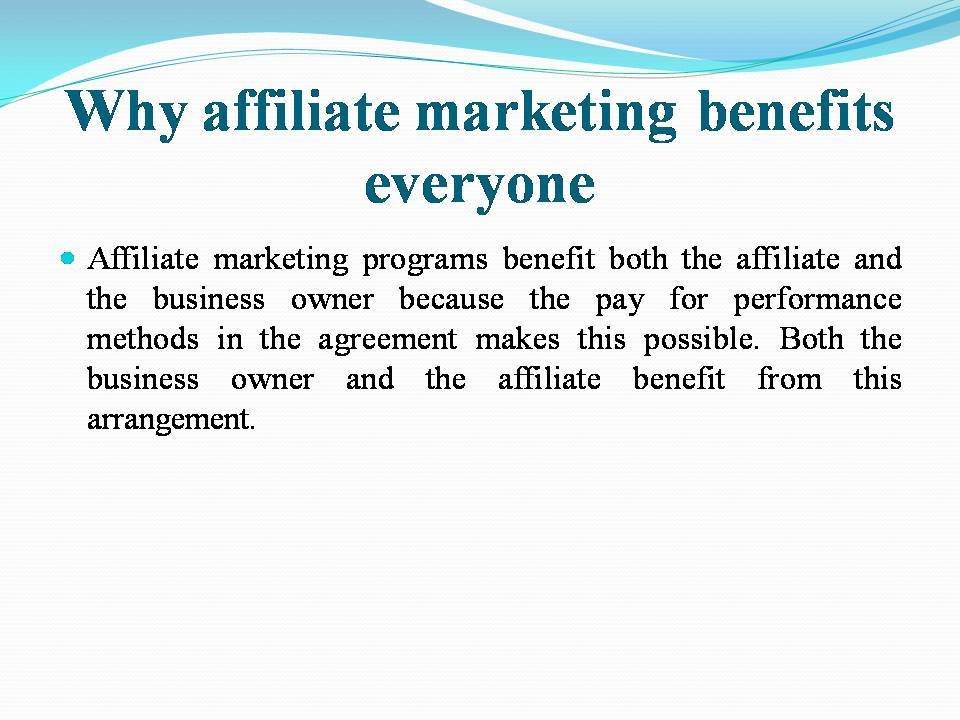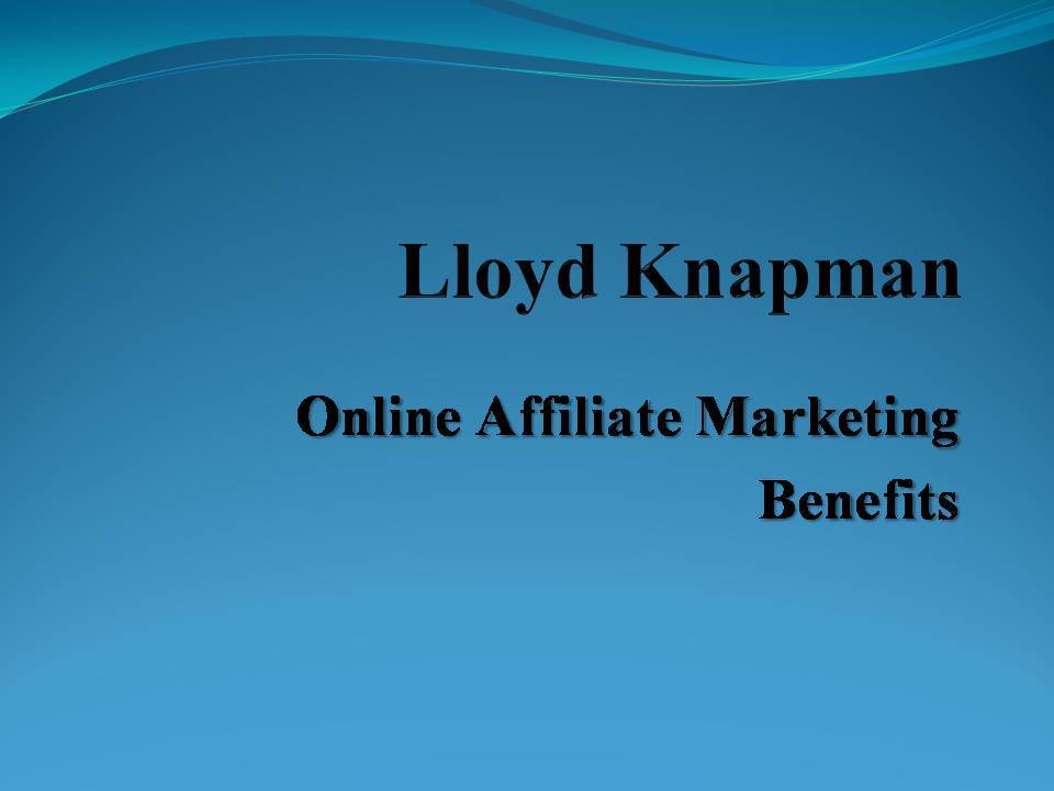 Lloyd Knapman - Affiliate marketing is a great way for people to earn money on the Internet. With affiliate marketing, people can earn money by selling products provided to them by merchants of the programs they must join. There are several benefits to affiliate marketing and in this presentation, we're going to talk about a few of those.