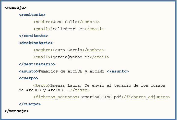 XML proporciona la habilidad de estructurar la información en forma de árbol. Estas partes, en XML se llaman elementos, y están comprendidos dentro de las etiquetas <,>.