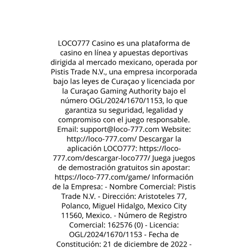 Website: https://loco-777.com/. LOCO777 Casino es una plataforma de casino en línea y apuestas deportivas dirigida al mercado mexicano, operada por Pistis Trade N.V., una empresa incorporada bajo las leyes de Curaçao y licenciada por la Curaçao Gamin