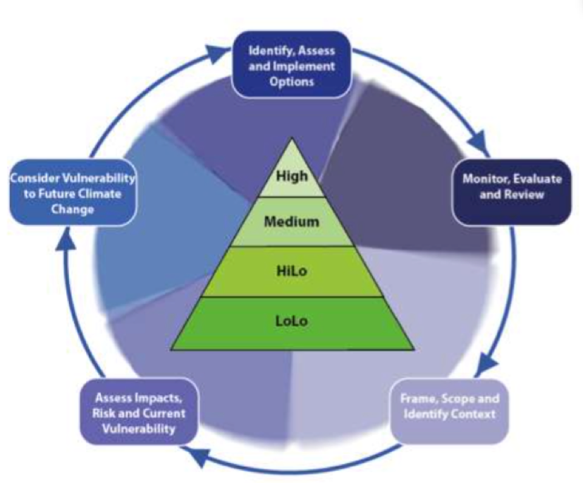 That stages of the resilience/adaptation planning process (purple, outside) have been mapped against adaptive capacity of agencies (green, centre) in this diagram (VCCCAR, 2014). This is also used to inform the engagement recommendations.