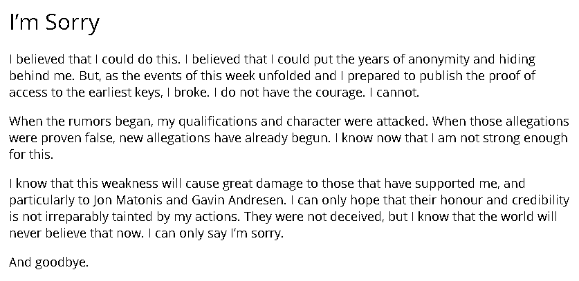- Craig Wright poste sur son blog (l'article a disparu) une signature d'un message qu'il aurait fait avec une des clés privées de Nakamoto Satoshi. (base64)