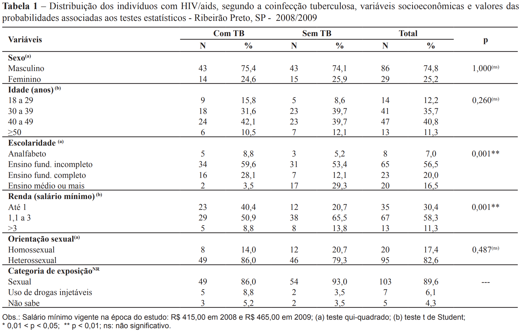 No ano de 2008 e 2009, no município de Ribeirão Preto foram notificados 391 pacientes com TB sendo que 84 (21,5%) apresentavam sorologia positiva para o HIV. Foram entrevistados 57 pacientes coinfectados HIV/TB que atendiam aos critérios de inclusão e 58 indivíduos soropositivos para o HIV sem TB que estavam em acompanhamento ambulatorial, totalizando 115 participantes do estudo.