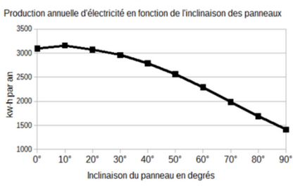 Afin d’optimiser la production d’énergie électrique du panneau photovoltaïque, déterminer à l’aide du document 2 (en page précédente) l’angle d’inclinaison du panneau photovoltaïque permettant de produire une énergie électrique maximale.