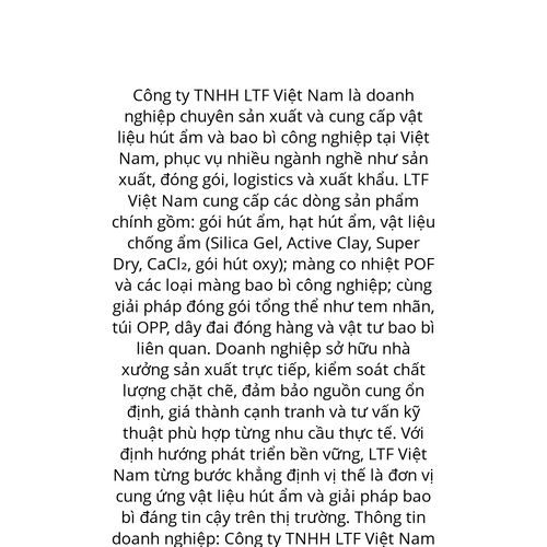 Website: https://ltf.com.vn/. Công ty TNHH LTF Việt Nam là doanh nghiệp chuyên sản xuất và cung cấp vật liệu hút ẩm và bao bì công nghiệp tại Việt Nam, phục vụ nhiều ngành nghề như sản xuất, đóng gói, logistics và xuất khẩu. LTF Việt Nam cung cấp các