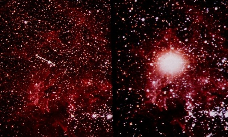 On the right is Supernova 1987A after the star has exploded. On the left is the star before it exploded.