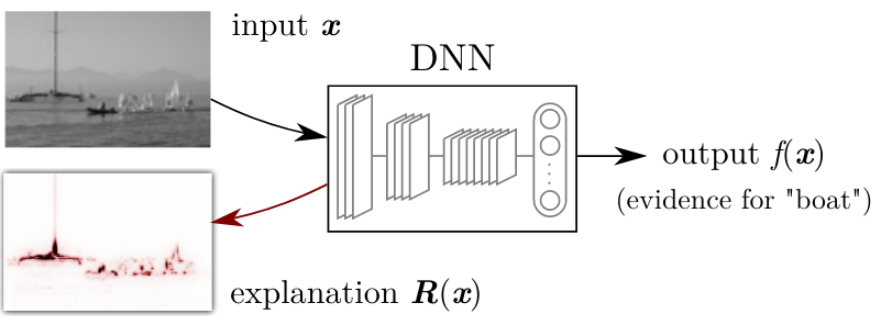 Figure 7: Example of the LRP method being applied to explain the prediction of class boat, given the image x. Source: Montavon et al.¹