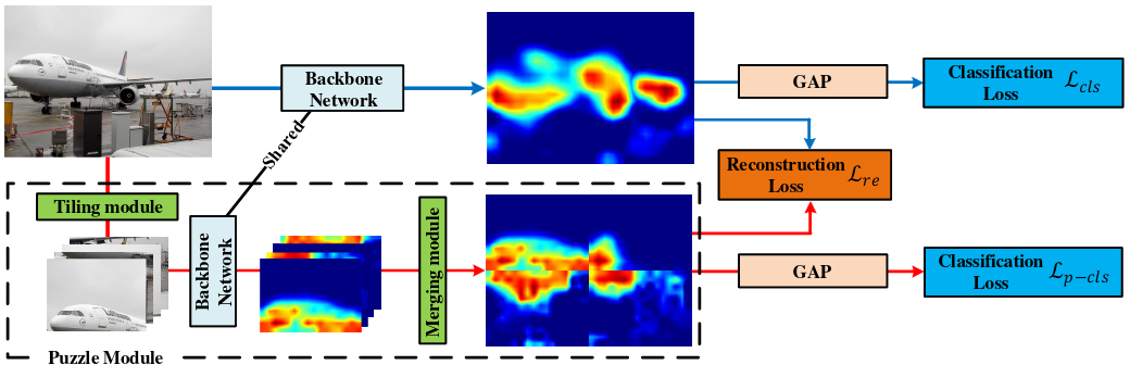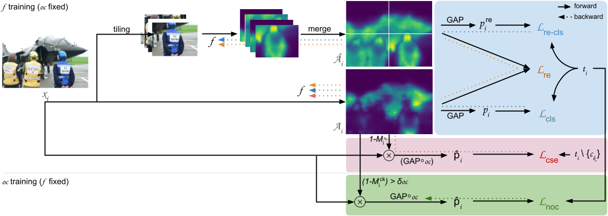 Figure 42: Overview of our adversarial training setup, in which f is optimized considering both Puzzle module and the ordinary classifier oc. f is sub-sequentially fixed and oc is updated to shift its attention towards regions currently ignored by f.