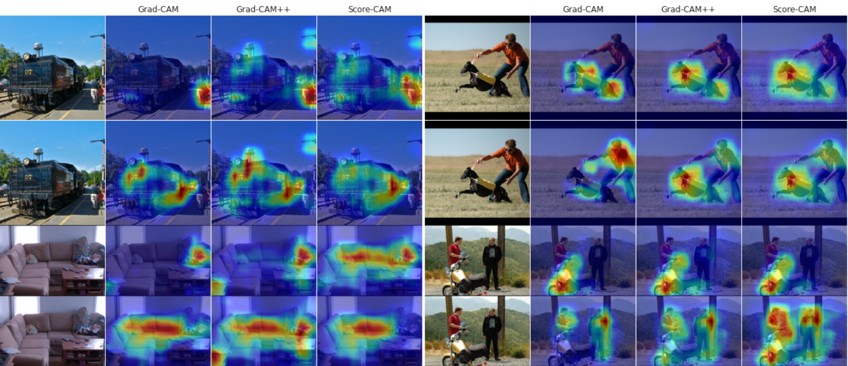 Figure 35: Comparison of CAMs obtained from various XAI methods. Predictions being explained are: person, train, motorcycle, person, chair, and table. Source: David et al.¹