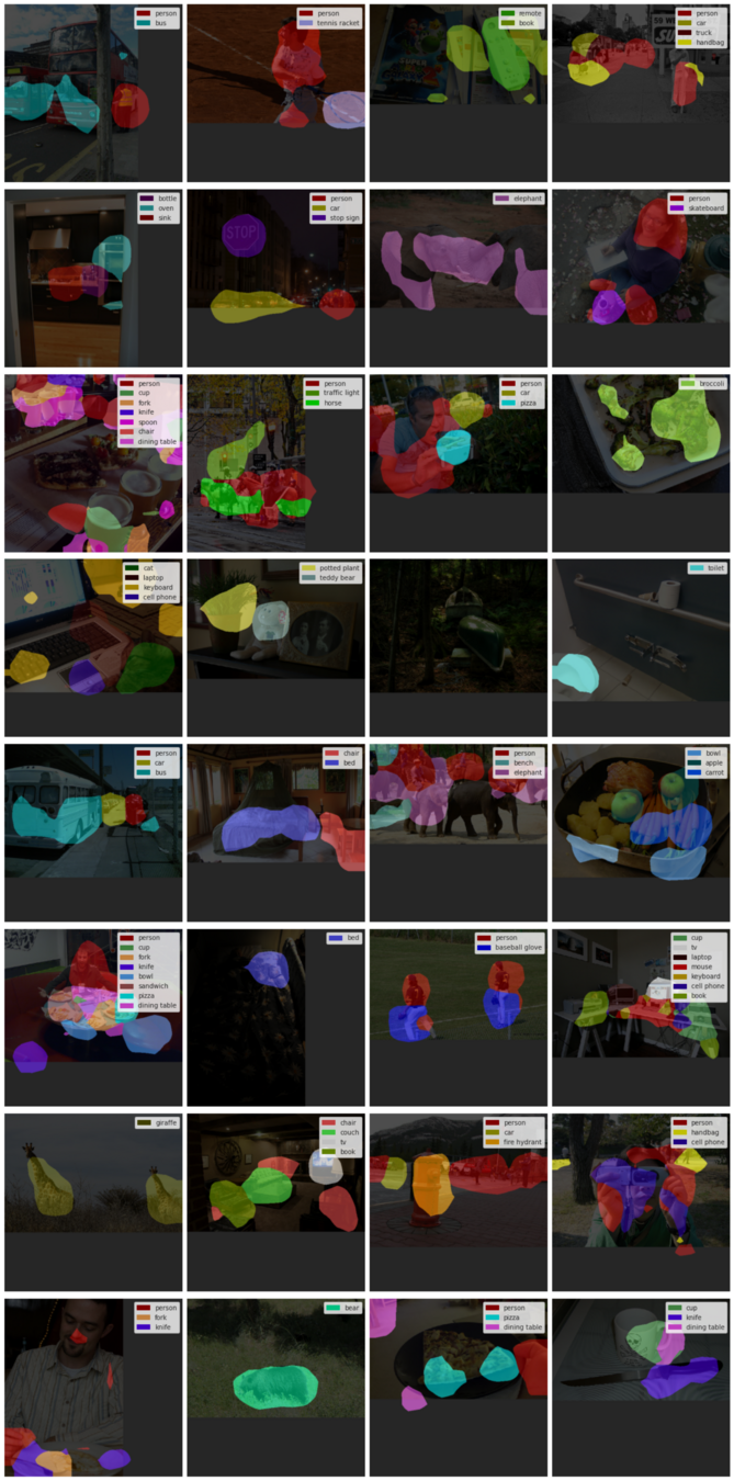 Figure 11: Example of samples and ground-truth panoptic segmentation annotation from the MS COCO 2017 dataset. Source: https://cocodataset.org/#panoptic-2020.