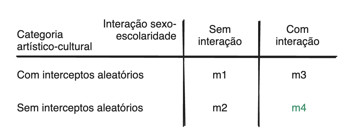 4. Em m4, com interações, dependendo do cruzamento entre raça, sexo e escolaridade dos proponentes, as chances de sucesso dos projetos podem ser de 8% (mulheres brancas de baixa escolaridade) a 50% menores (homens não brancos de baixa escolaridade) em relação a homens brancos de alta escolaridade.
