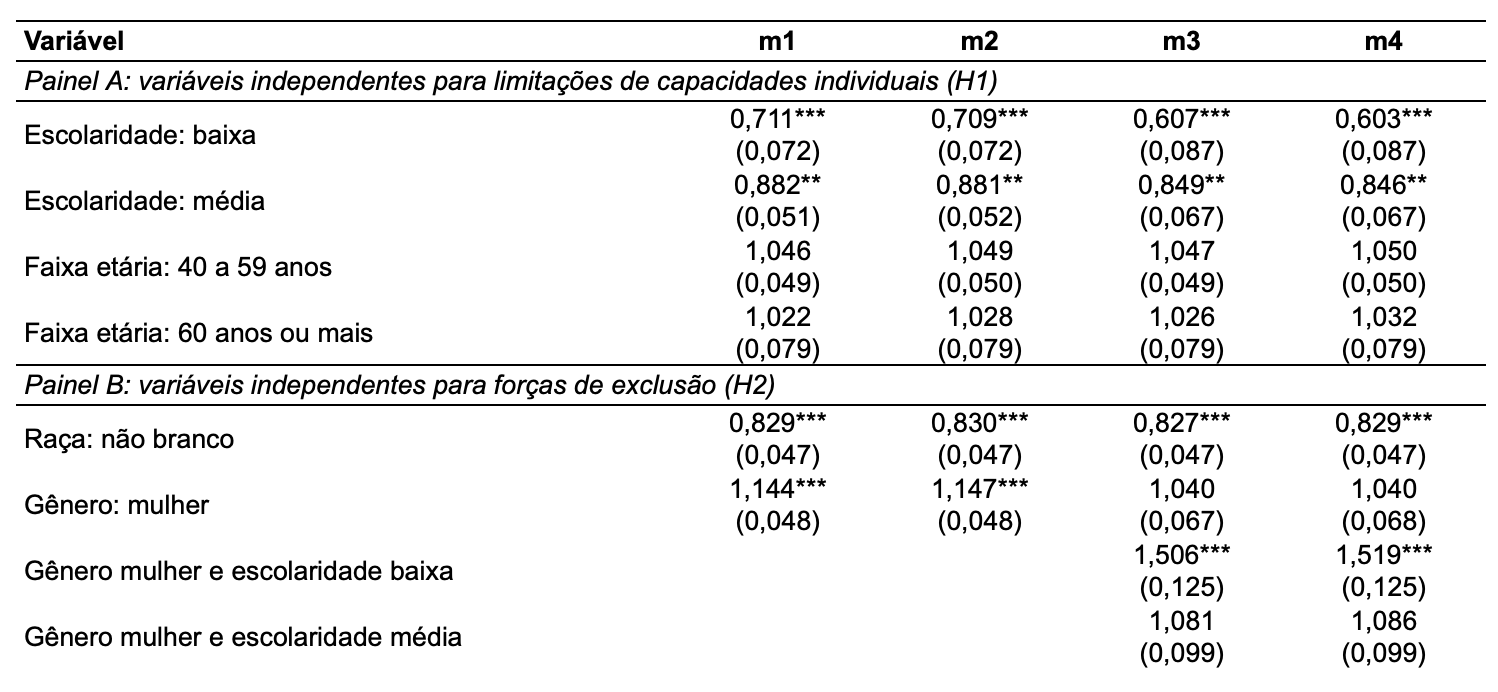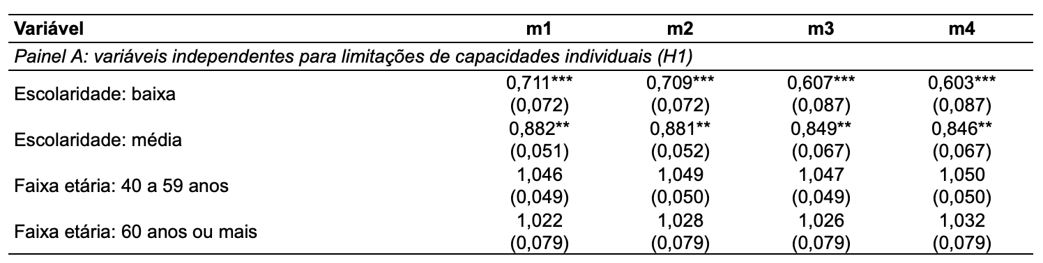 3. Variáveis independentes: dummies, cujos coeficientes são interpretados em relação às categorias de referência (omitidas).