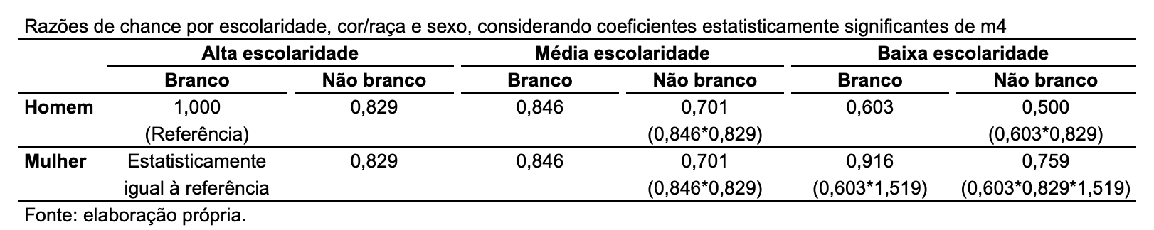 2. Isso só se verifica no subgrupo de baixa escolaridade. Quando detectado o diferencial por sexo, ele favorece as mulheres desse subgrupo: