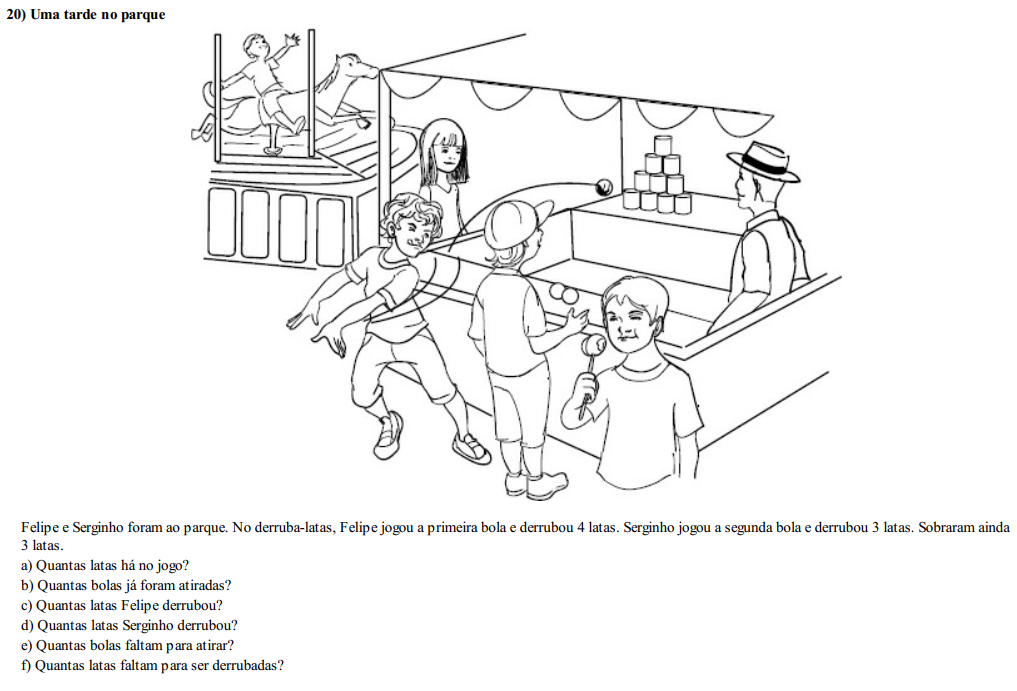 Felipe e Serginho foram foram ao parque. No derruba-latas, Felipe jogou a bola e derrubou 4 latas. Serginho jogou a segunda bola e derrubou 3 latas. Sobraram ainda 3 latas.