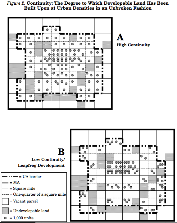 Continuinty is the degree to which developable land has been built upon at urban densities in an unbroken fashion.