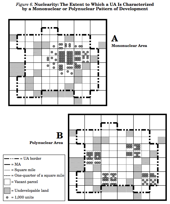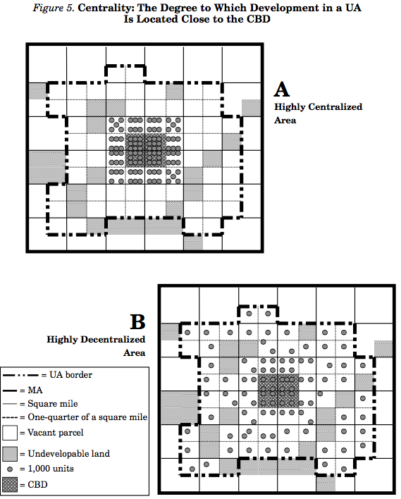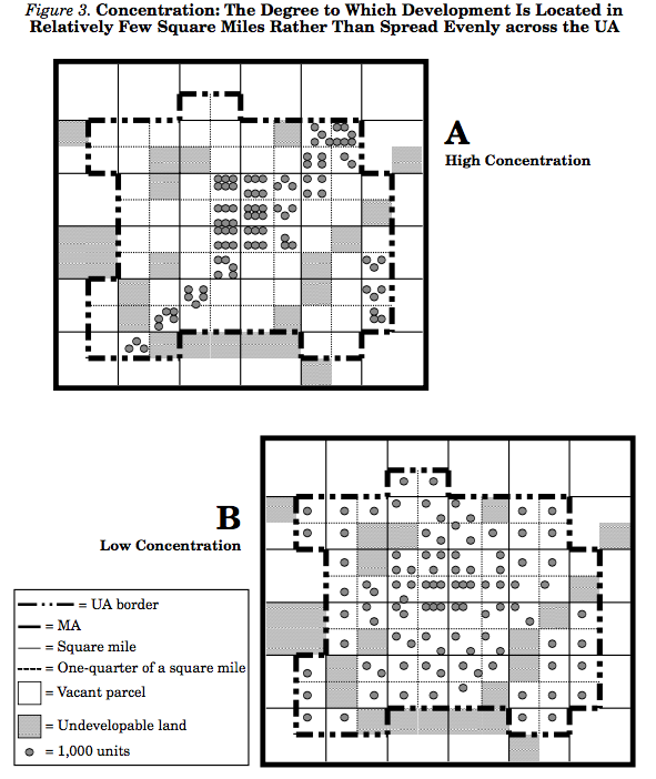 Concentration is the degree to which development is located disproportionately in relatively few square miles of the total UA rather than spread evenly throughout.