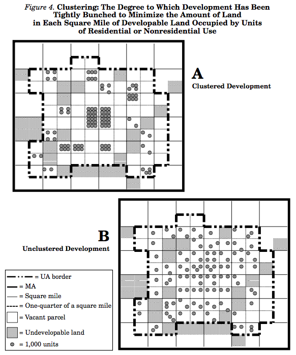 Clustering is the degree to which development has been tightly bunched to minimize the amount of land in each square mile of developable land occupied by residential or nonresidential uses.