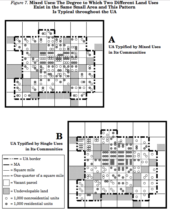 Mixed uses means the degree to which two different land uses commonly exist within the same small area, and this is common across the UA.
