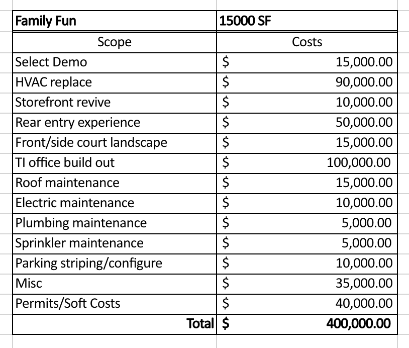 Primary scope of work: Select demo, HVAC replace throughout, Storefront revive, Minor TI Maintenance/Repair: Roof, Electric, Sprinkler *FFE + vacant 2 acres Not Included
