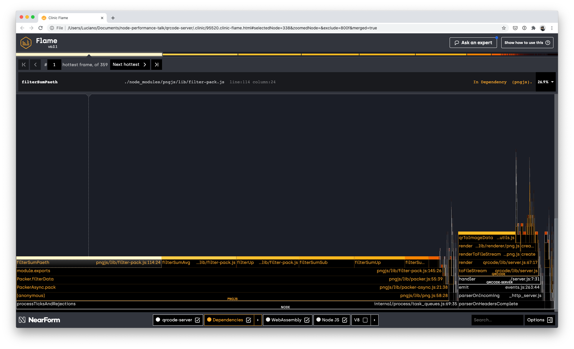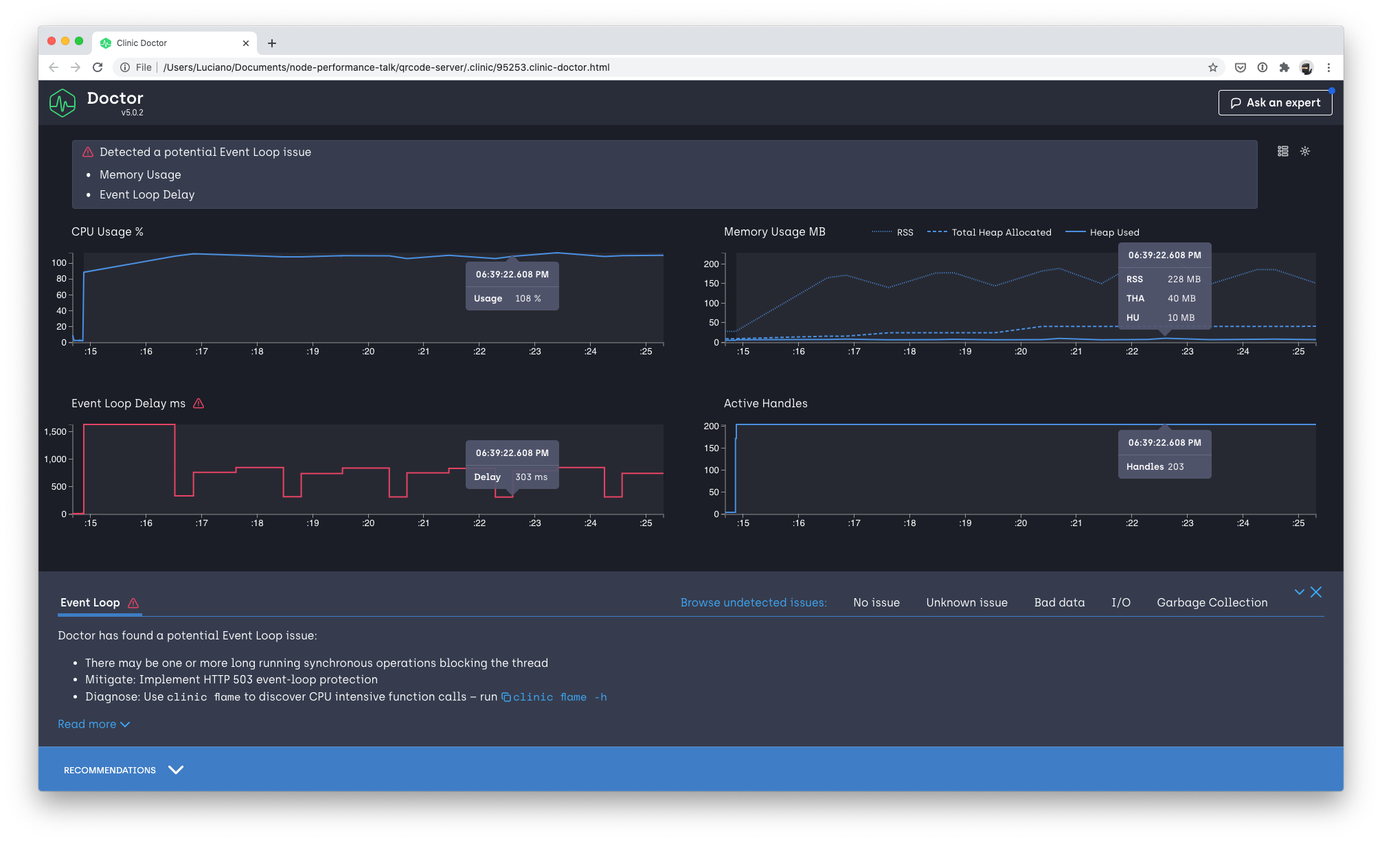 333k requests in 10.1s, 51.9 MB readclinic doctor --autocannon [ -c 200 '/?data=ciao๐' ] -- node server.jsclinic flame --autocannon [ -c 200 '/?data=ciao๐' ] -- node server.jsclinic bubble --autocannon [ -c 200 '/?data=ciao๐' ] -- node server.jsLogs - Metrics - Traces