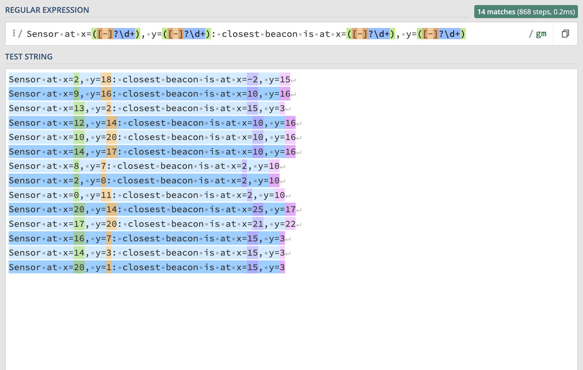 r"Sensor at x=(?P<x1>[-]?\d+), y=(?P<y1>[-]?\d+): closest beacon is at x=(?P<x2>[-]?\d+), y=(?P<y2>[-]?\d+)",