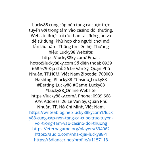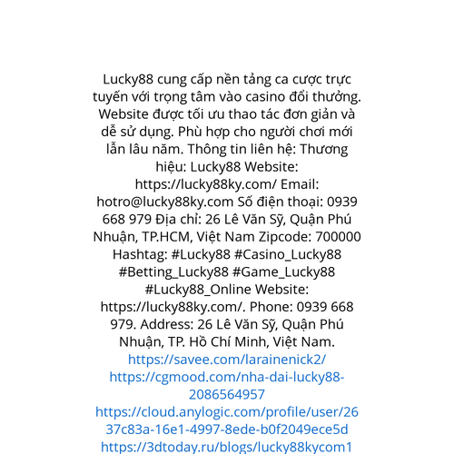 Website: https://lucky88ky.com/. Lucky88 cung cấp nền tảng ca cược trực tuyến với trọng tâm vào casino đổi thưởng. Website được tối ưu thao tác đơn giản và dễ sử dụng. Phù hợp cho người chơi mới lẫn lâu năm. Thông tin liên hệ: Thương hiệu: Lucky88 W