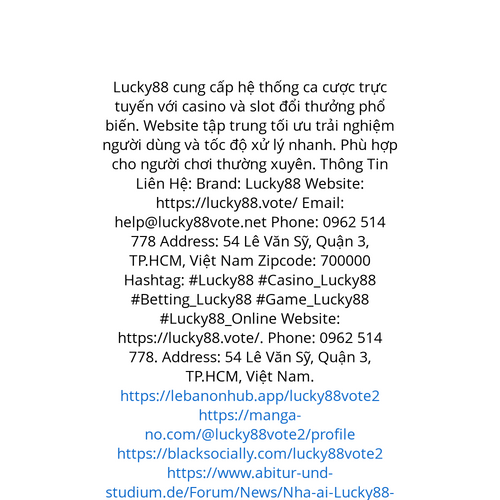Website: https://lucky88.vote/. Lucky88 cung cấp hệ thống ca cược trực tuyến với casino và slot đổi thưởng phổ biến. Website tập trung tối ưu trải nghiệm người dùng và tốc độ xử lý nhanh. Phù hợp cho người chơi thường xuyên. Thông Tin Liên Hệ: Brand