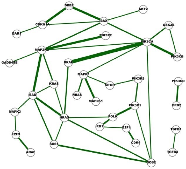 Fig. 6. A network of strong cross-cancer interactions. Cancer Genetic Network Inference Using Gaussian Graphical Models. (2019) Zhao and Duan.