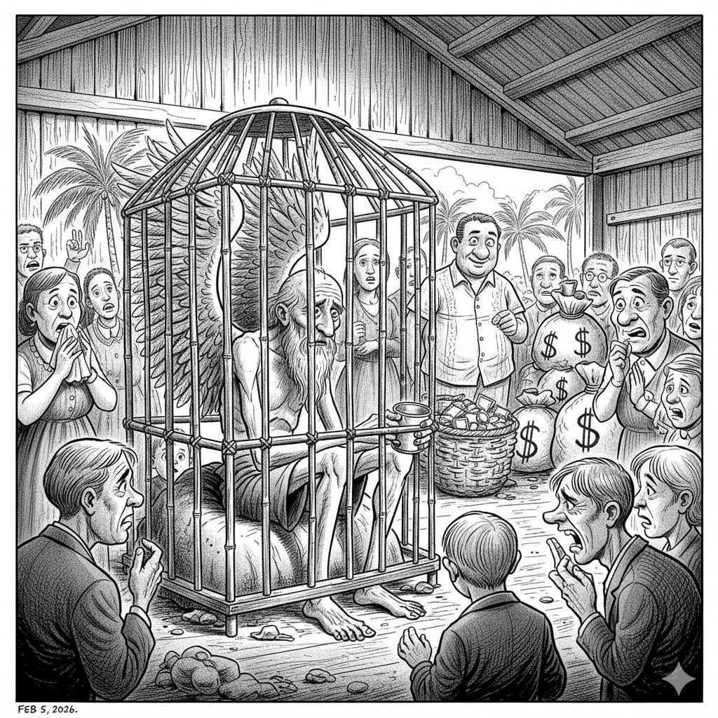 “Tuvo que acercarse mucho para descubrir que era un hombre viejo, que estaba tumbado boca abajo en el lodazal, y a pesar de sus grandes esfuerzos no podía levantarse, porque se lo impedían sus enormes alas.”