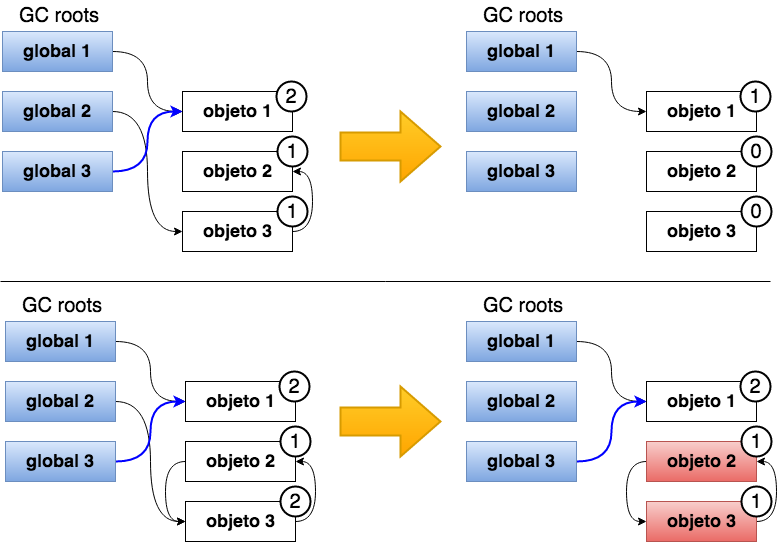 - Si un objecto tiene refcount = 0, se considera inalcanzable y se elimina