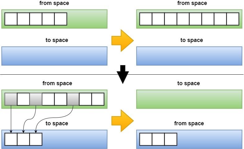 - Al llenarse una, se copian los objetos referenciados a la otra (previamente limpiada), intercambiándose los roles